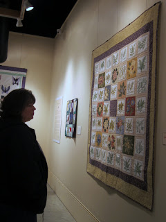 Below, my friend Judi makes beautiful quilts for the fundraising efforts of all the local nonprofits (that's also her "manly hibernation quilt" hanging behind the couch on the auction set). In addition to that, she makes "comfort quilts" for people going through times of stress, whether it's a illness, a death in the family, or any number of other reasons someone might need some extra TLC. She sent a sweet quilt to Emery when she was recovering from her treatment. So the local museum decided that Judi should be honored with her own exhibit and many of her quilts were gathered up for the display. The opening was held the other night and we had a lovely time browsing and chatting.